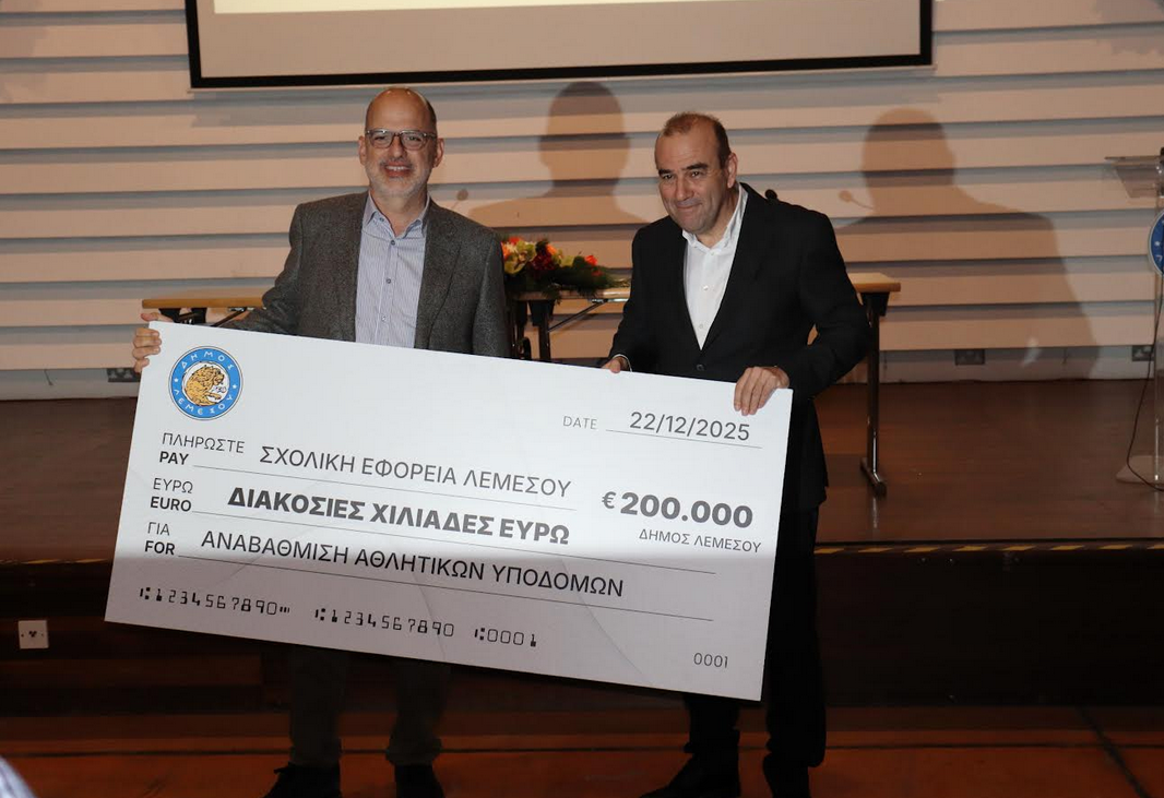 Ο Δήμος Λεμεσού παρέδωσε χορηγία ύψους €200.000 στη Σχολική Εφορεία για σκοπούς αναβάθμισης των αθλητικών υποδομών.