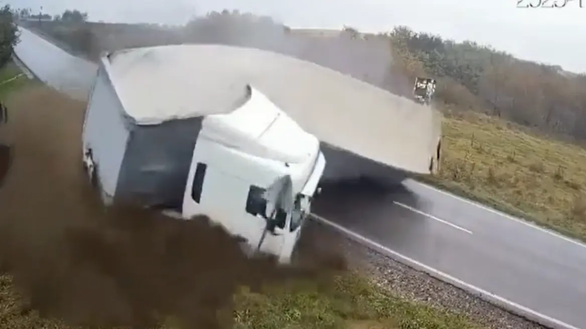 Στο βίντεο που εξασφαλίστηκε από κάμερα ασφαλείας φαίνεται ότι στο θανατηφόρο τροχαίο ενεπλάκησαν ένα φορτηγό και ένα αυτοκίνητο με τον οδηγό του πρώτου να χάνει τον έλεγχο του μεγάλου οχήματος που δίπλωσε στον δρόμο με αποτέλεσμα να συνθλίψει το ΙΧ που βρισκόταν στο αντίθετο ρεύμα κυκλοφορίας.