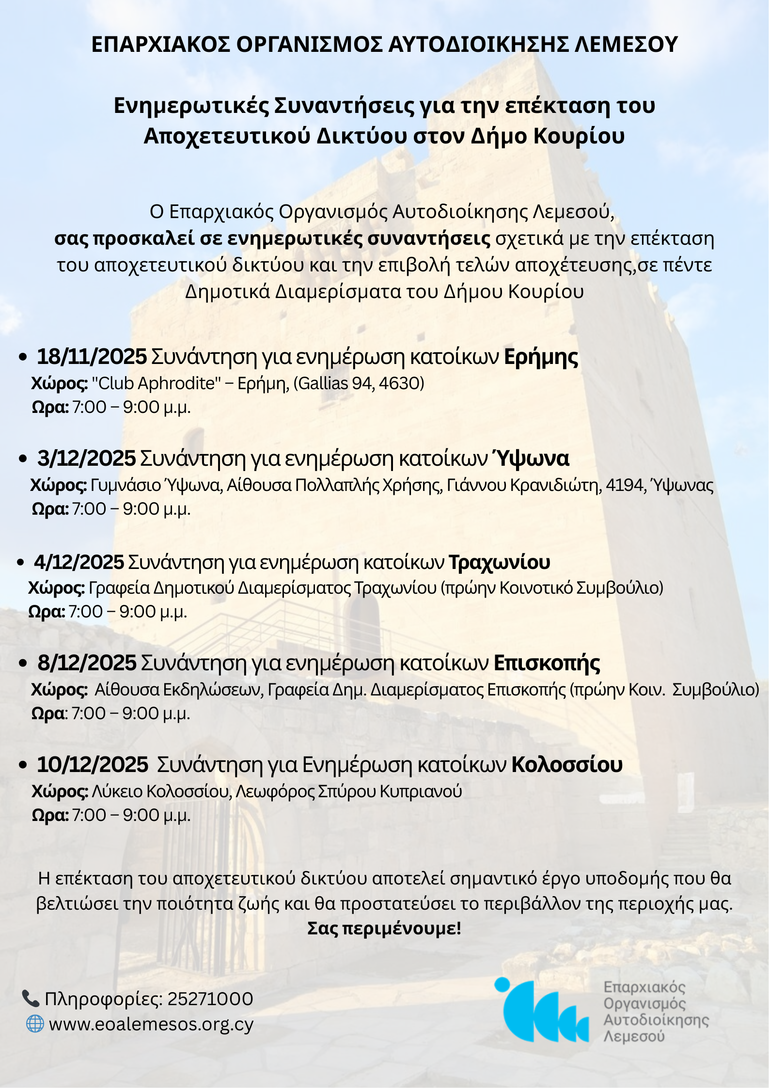 Ο ΕΟΑ Λεμεσού καλεί όλους τους κατοίκους να παρευρεθούν στις συναντήσεις, καθώς η ενημέρωση και η ενεργός συμμετοχή του κοινού αποτελούν σημαντικό μέρος της επιτυχούς υλοποίησης του έργου.