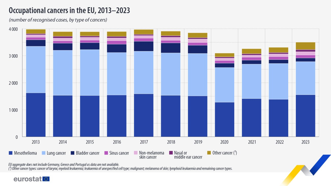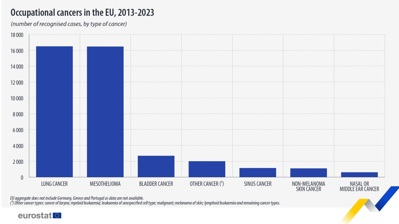 Σύμφωνα με την Eurostat, το 2023, αναγνωρίστηκαν 3.500 περιπτώσεις καρκίνου που σχετίζονται με την εργασία, 191 περισσότερες από ό,τι το 2022 (3.309).