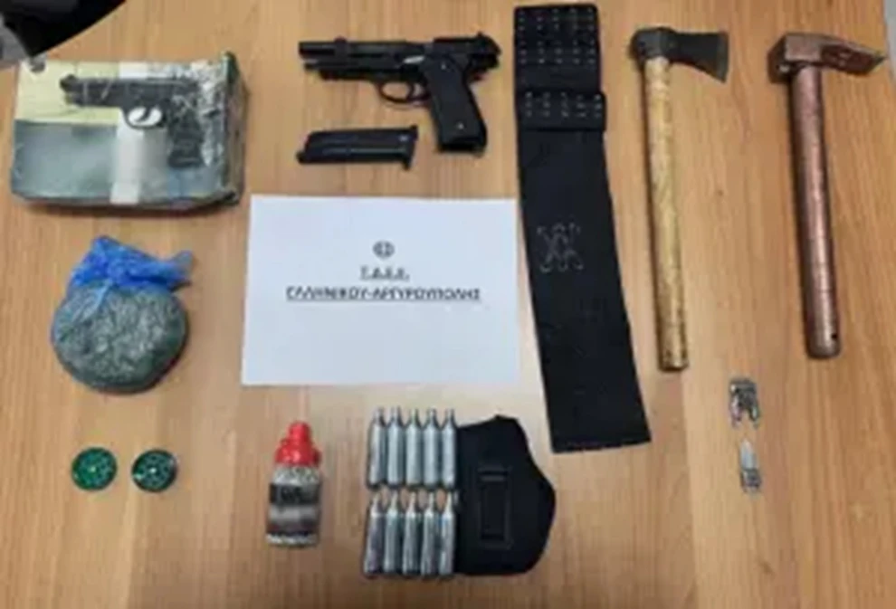 Μετά από έρευνα που διενεργήθηκε στο αυτοκίνητό του και σε δωμάτιο ξενοδοχείου που διαμένει βρέθηκαν συνολικά και κατασχέθηκαν τα ακόλουθα: τσεκούρι, σκεπάρνι, αεροβόλο πιστόλι, 52 γραμμ. ακατέργαστης κάνναβης, μαχαίρι-μπρελόκ, 1500 σφαίρες και 10 αμπούλες αεροβόλου πιστολιού και τρίφτης ναρκωτικών ουσιών