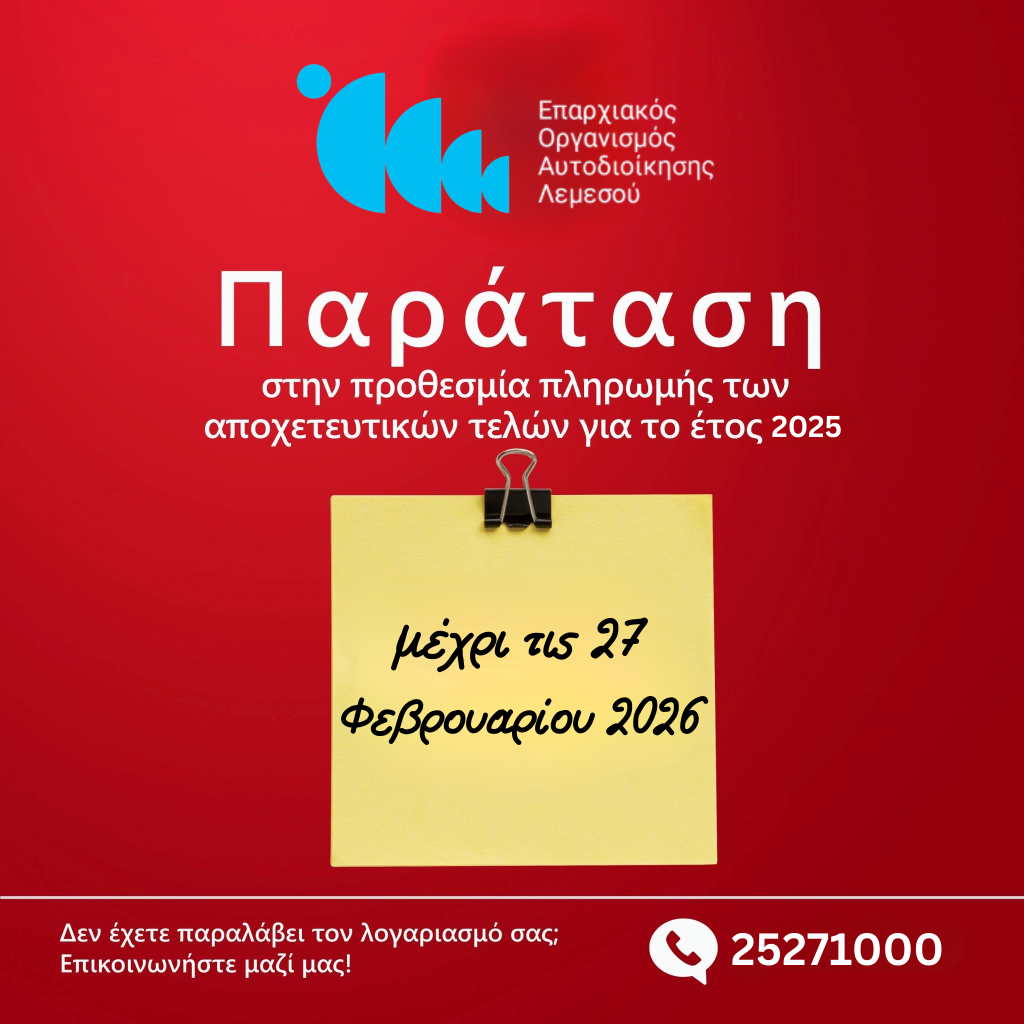 Η τελευταία ημερομηνία πληρωμής των τελών αποχέτευσης έχει παραταθεί από τον ΕΟΑ Λεμεσού μέχρι τις 27 Φεβρουαρίου 2026.