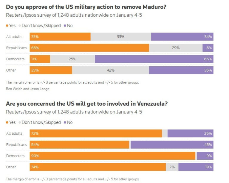 Μόνο ένας στους τρεις Αμερικανούς εγκρίνει την στρατιωτική επίθεση των ΗΠΑ στη Βενεζουέλα και την απαγωγή του Νικολάς Μαδούρο, ενώ το 72% ανησυχεί ότι οι ΗΠΑ θα εμπλακούν υπερβολικά στη χώρα της Νότιας Αμερικής, σύμφωνα με δημοσκόπηση των Reuters/Ipsos που ολοκληρώθηκε σήμερα Δευτέρα.