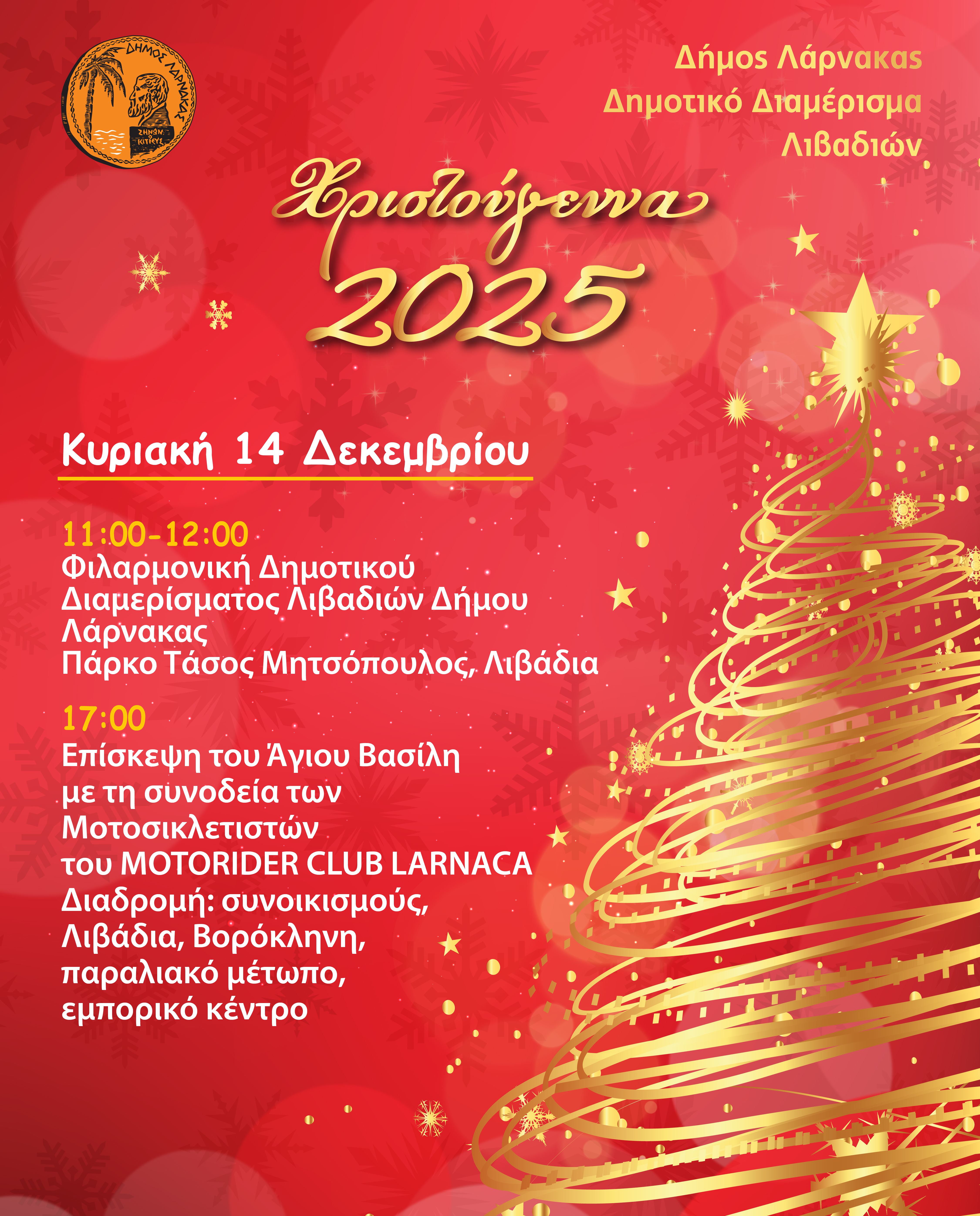 Ο Δήμος Λάρνακας Δημοτικό Διαμέρισμα Λιβαδιών, ενημερώνει το κοινό ότι η αναβληθείσα φωταγώγηση, που ήταν προγραμματισμένη για τις 6 Δεκεμβρίου, θα πραγματοποιηθεί το Σάββατο 13 Δεκεμβρίου 2025.