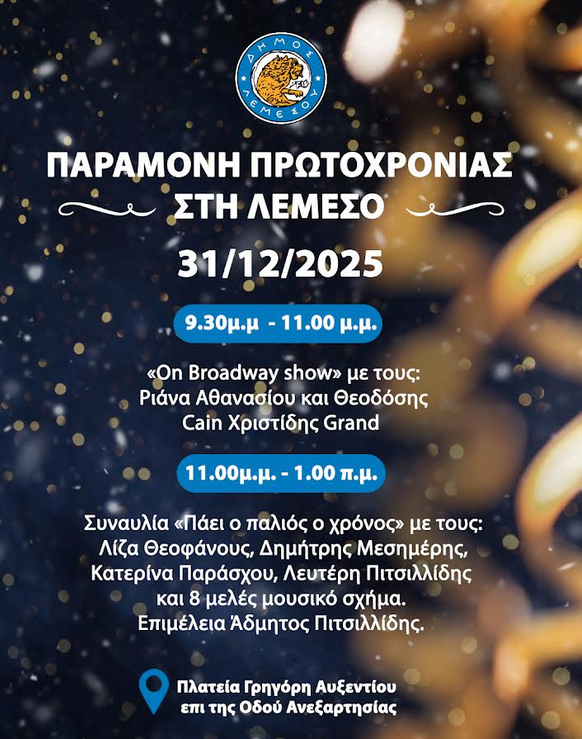 Ο Δήμος Λεμεσού προσκαλεί κατοίκους και επισκέπτες της πόλης να γιορτάσουν την Παραμονή Πρωτοχρονιάς στην Πλατεία Γρηγόρη Αυξεντίου, επί της οδού Ανεξαρτησίας, σε μια μεγάλη ανοιχτή γιορτή με μουσική και εορταστική διάθεση.