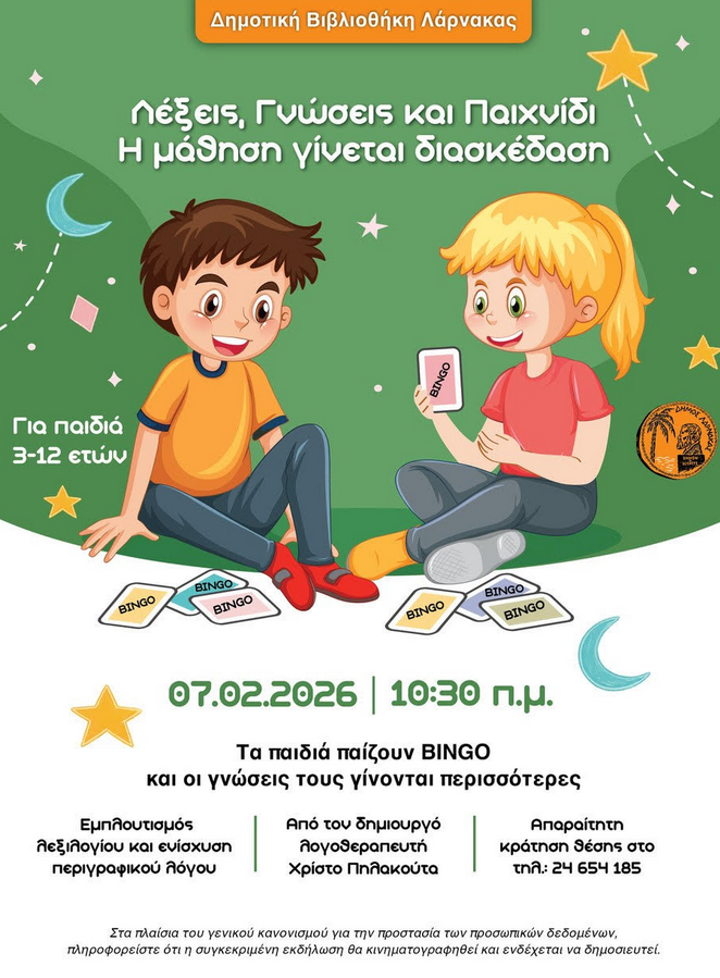 Μια διαδραστική και εκπαιδευτική δράση για παιδιά διοργανώνει η Δημοτική Βιβλιοθήκη Λάρνακας το Σάββατο 7 Φεβρουαρίου 2026, στις 10:30 π.μ. Με τίτλο «Λέξεις, Γνώσεις και Παιχνίδι – Η μάθηση γίνεται διασκέδαση», παιδιά ηλικίας 3 έως 12 ετών θα έχουν την ευκαιρία να παίξουν BINGO και, μέσα από το παιχνίδι, να εμπλουτίσουν το λεξιλόγιό τους και να ενισχύσουν τον περιγραφικό τους λόγο. Η δράση υλοποιείται από τον δημιουργό και λογοθεραπευτή Χρίστο Πηλακούτα. Απαραίτητη η κράτηση θέσης.