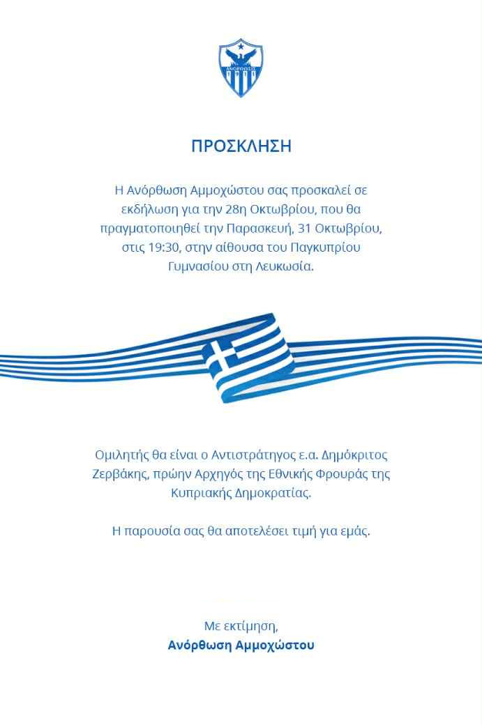 Η Ανόρθωση Αμμοχώστου τιμά την Εθνική Επέτειο της 28ης Οκτωβρίου με ειδική εκδήλωση που θα πραγματοποιηθεί την Παρασκευή, 31 Οκτωβρίου, στις 19:30, στην Αίθουσα Τελετών του Παγκυπρίου Γυμνασίου, στη Λευκωσία.