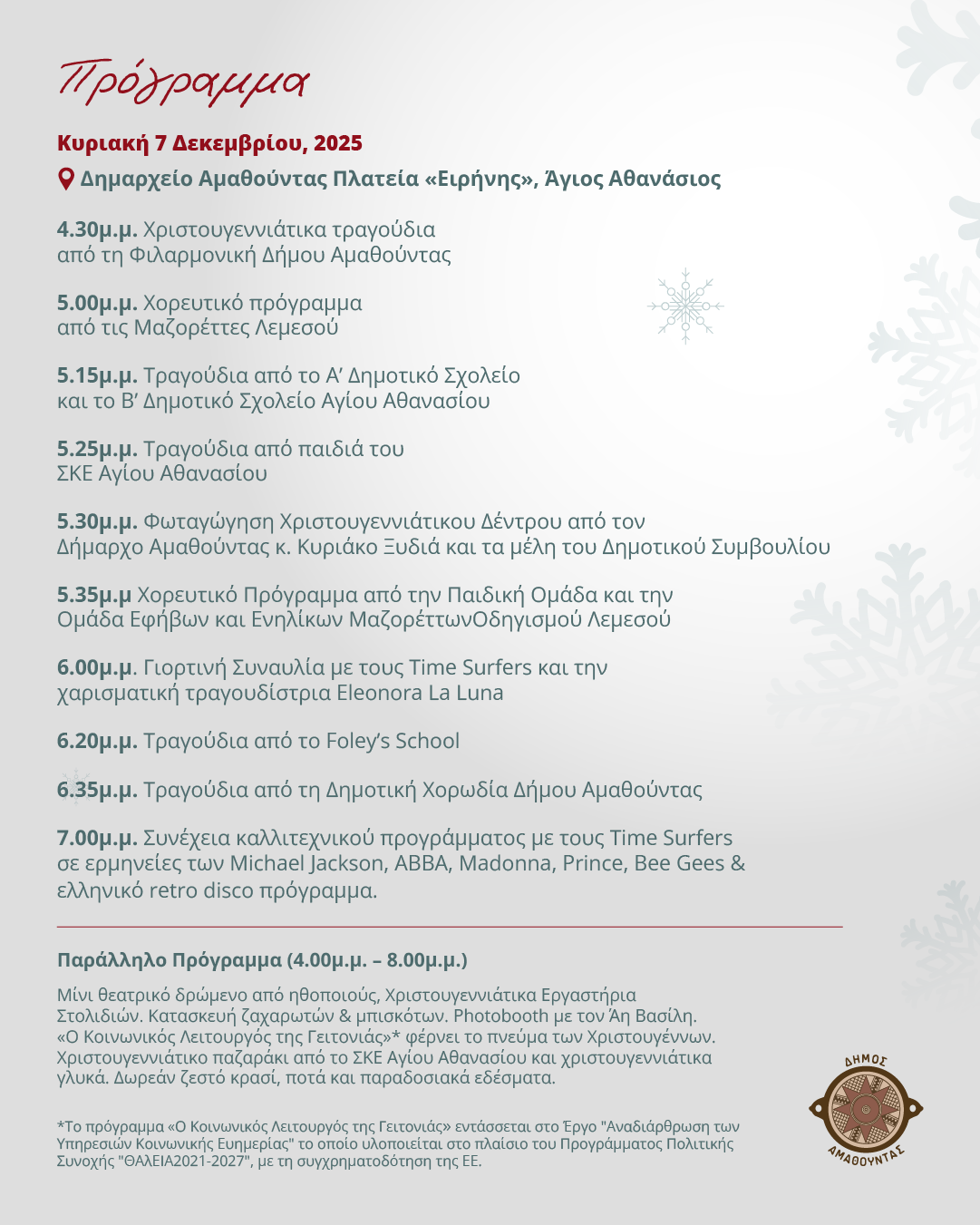 • Συναυλία: Θα ακολουθήσει Γιορτινή Συναυλία με τους Time Surfers και τη χαρισματική τραγουδίστρια Eleonora La Luna, με ένα πρόγραμμα που περιλαμβάνει διεθνείς επιτυχίες (Michael JacksonABBAMadonna) και ελληνικό retro disco.