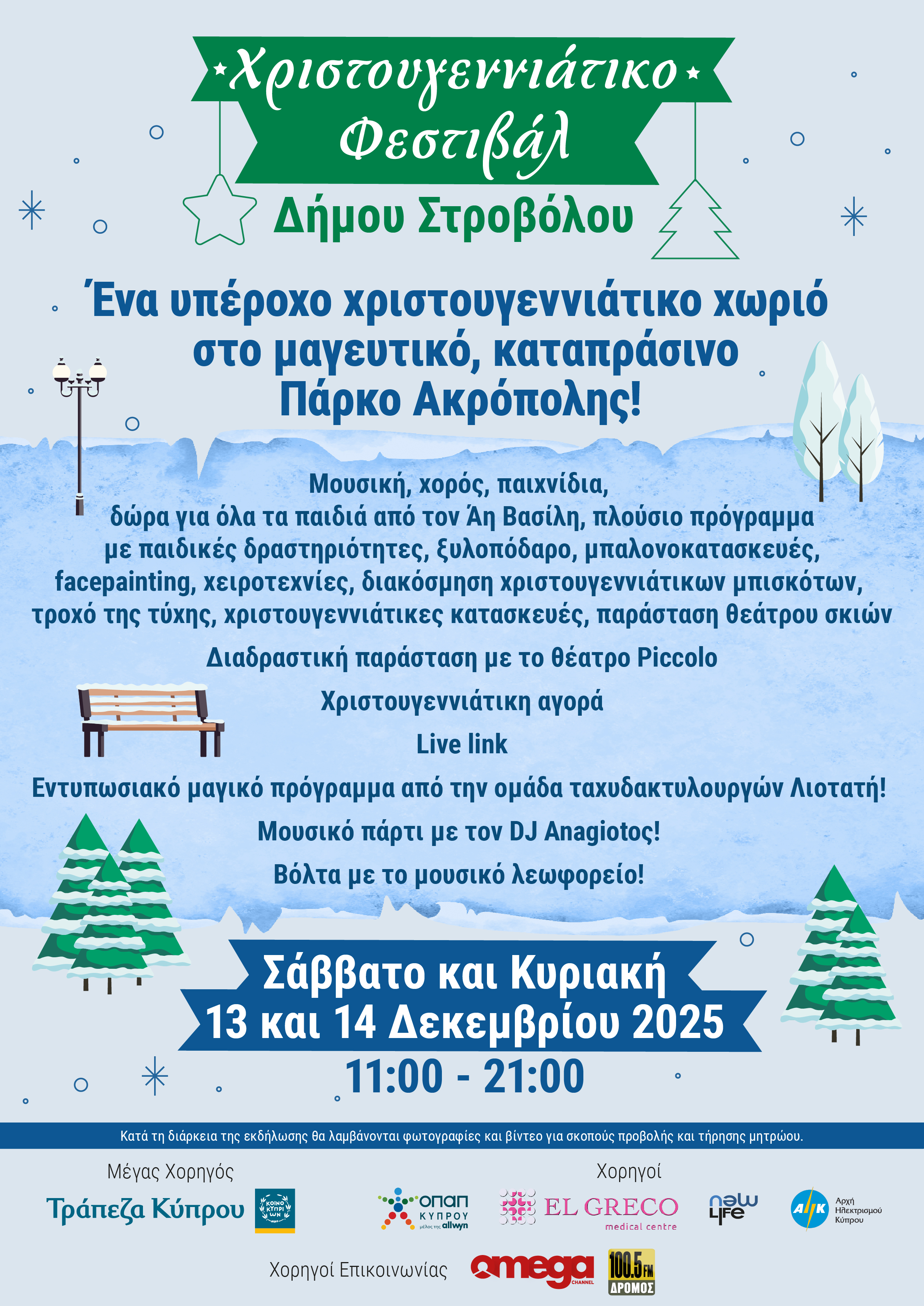 Ένα υπέροχο χριστουγεννιάτικο χωριό θα στηθεί στο μαγευτικό, καταπράσινο Πάρκο Ακρόπολης το Σαββατοκύριακο 13 και 14/12/25, για να φιλοξενήσει το Χριστουγεννιάτικο Φεστιβάλ του Δήμου Στροβόλου!
