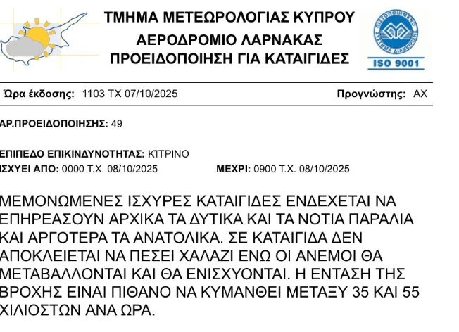 Η προειδοποίηση της Μετεωρολογικής Υπηρεσίας έχει ισχύ από τις 12 τα μεσάνυχτα της Τρίτης μέχρι τις 9 το πρωί και αφορά σε μεμονωμένες ισχυρές καταιγίδες οι οποίες ενδέχεται να επηρέασουν αρχικά τα δυτικά και τα νότια παράλια και αργότερα τα ανατολικά.