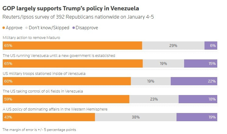 Η διήμερη δημοσκόπηση (Κυριακή 4/12 – Δευτέρα 5/12) έδειξε ότι το 65% των Ρεπουμπλικανών υποστηρίζει την στρατιωτική επιχείρηση που διέταξε ο Ρεπουμπλικάνος πρόεδρος Ντόναλντ Τραμπ, σε σύγκριση με το 11% των Δημοκρατικών και το 23% των ανεξάρτητων.