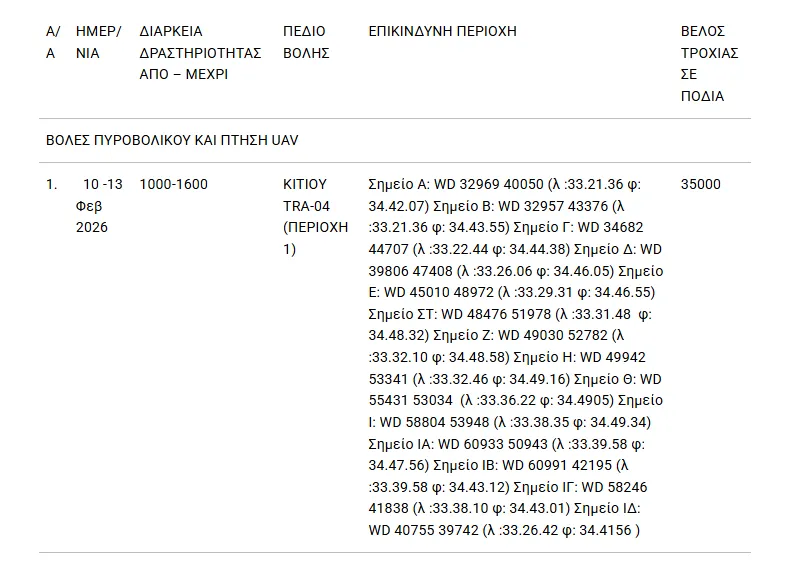 Το Γενικό Επιτελείο Εθνικής Φρουράς (ΓΕΕΦ) ανακοινώνει ότι θα διεξαχθούν βολές-εκρήξεις στην περιοχή του Πεδίου Βολής Κιτίου, κατά τον μήνα Φεβρουάριο 2026, προκειμένου να ενημερωθεί το κοινό και οι Αρχές προς αποφυγή ατυχημάτων και ανησυχίας.