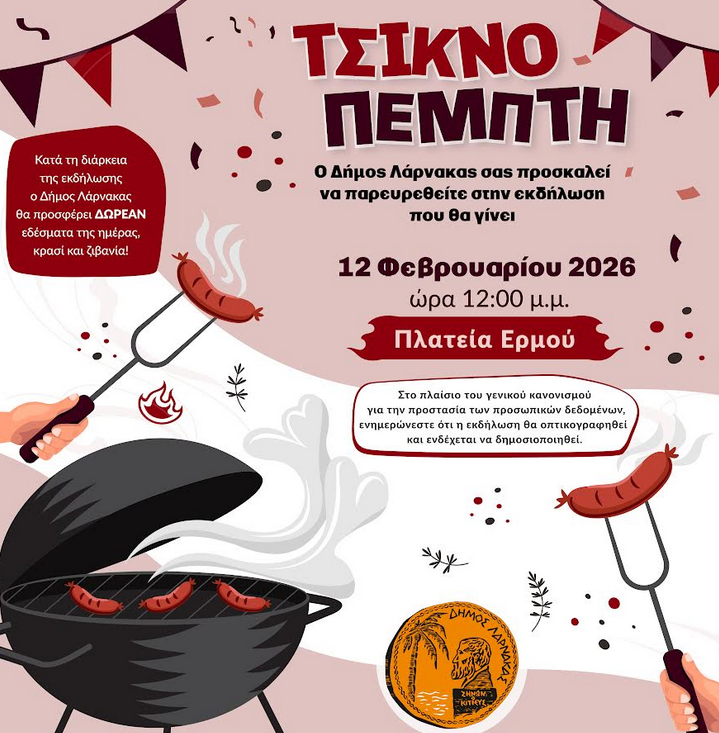Ο Δήμος Λάρνακας ενημερώνει ότι στο πλαίσιο των εορτασμών της Τσικνοπέμπτης διοργανώνει εκδήλωση την Πέμπτη 12 Φεβρουαρίου 2026 και ώρα 12:00 μ.μ., στην Πλατεία Ερμού.