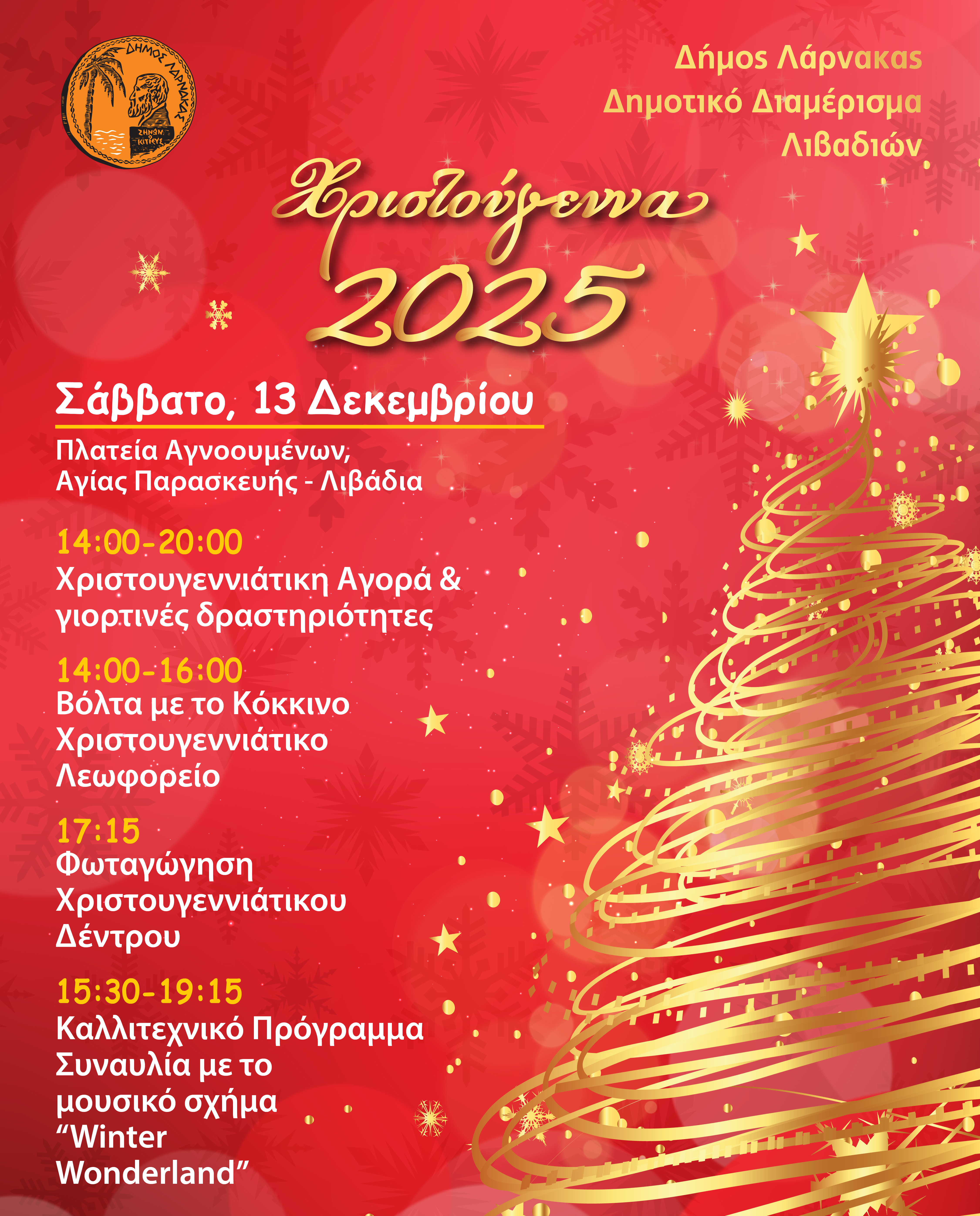 Ο Δήμος Λάρνακας Δημοτικό Διαμέρισμα Λιβαδιών, ενημερώνει το κοινό ότι η αναβληθείσα φωταγώγηση, που ήταν προγραμματισμένη για τις 6 Δεκεμβρίου, θα πραγματοποιηθεί το Σάββατο 13 Δεκεμβρίου 2025.
