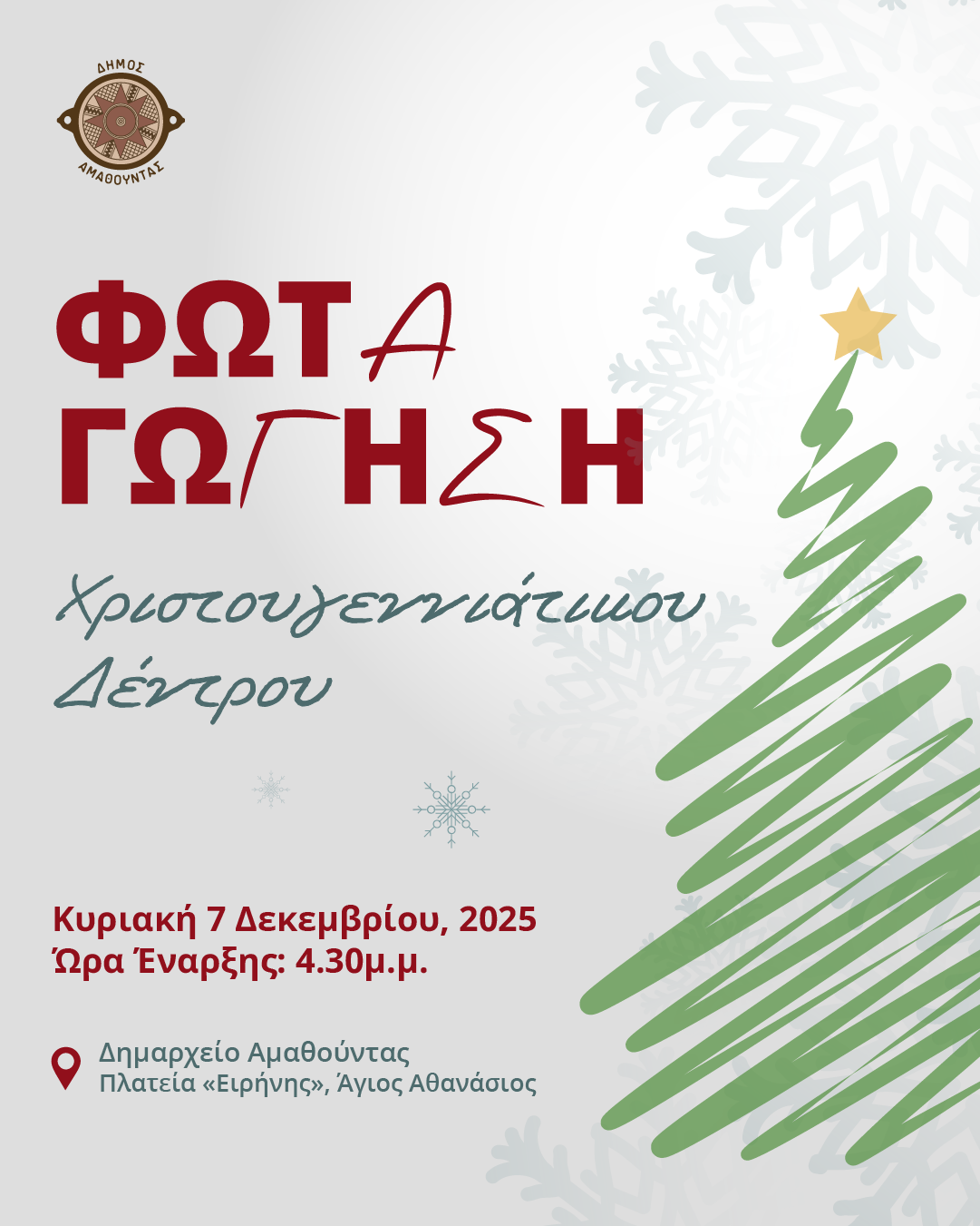 Ο Δήμος Αμαθούντας υποδέχεται τη χριστουγεννιάτικη περίοδο με δύο μεγάλες, εορταστικές δράσεις, καλώντας τους δημότες να βιώσουν τη μαγεία των Χριστουγέννων σε όλες τις γωνιές του Δήμου.