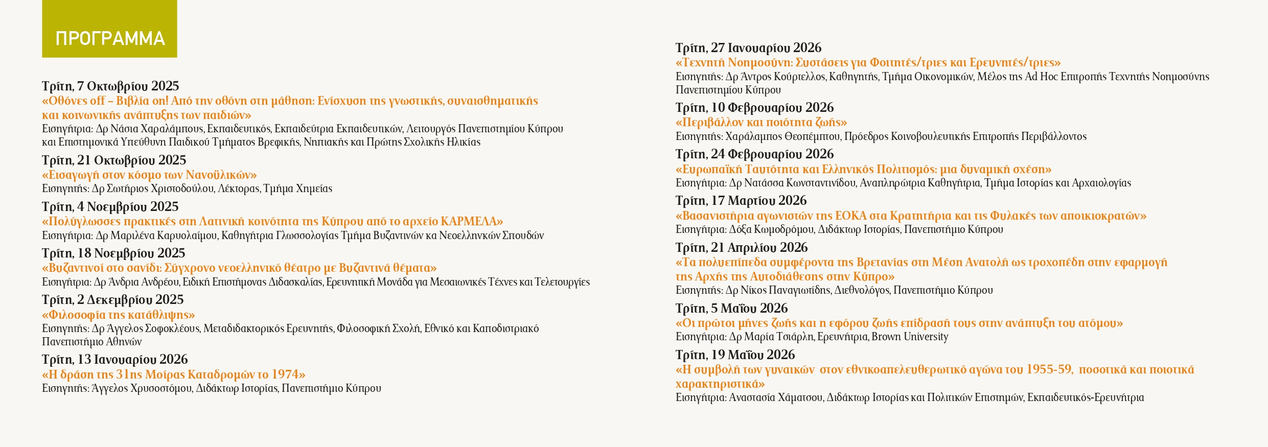 Οι διαλέξεις πραγματοποιούνται στη Στέγη Γραμμάτων και Τεχνών -Δημοτικό Πολιτιστικό Κέντρο «Αμμόχωστος», Λεωφόρος Αρχ. Κυπριανού 18, Λάρνακα, στις 7:30 μ.μ. Μεταδίδονται μέσω του καναλιού του ΡΙΚ στο YouTube στον σύνδεσμο https://bit.ly/3eaAvf2, ενώ στη συνέχεια θα είναι δυνατή η παρακολούθησή τους μέσω της ιστοσελίδας του ΡΙΚ στον σύνδεσμο http://cybc.com.cy/audio-on-de