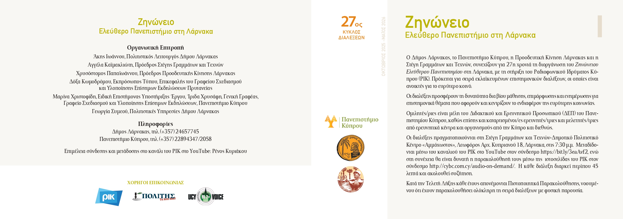 Ο Δήμος Λάρνακας, το Πανεπιστήμιο Κύπρου, η Προοδευτική Κίνηση Λάρνακας και η Στέγη Γραμμάτων και Τεχνών, συνεχίζουν για 27η χρονιά τη διοργάνωση του Ζηνώνειου Ελεύθερου Πανεπιστημίου στη Λάρνακα, με τη στήριξη του Ραδιοφωνικού Ιδρύματος Κύπρου (ΡΙΚ). Πρόκειται για σειρά εκλαϊκευμένων επιστημονικών διαλέξεων, οι οποίες είναι ανοικτές για το ευρύτερο κοινό.