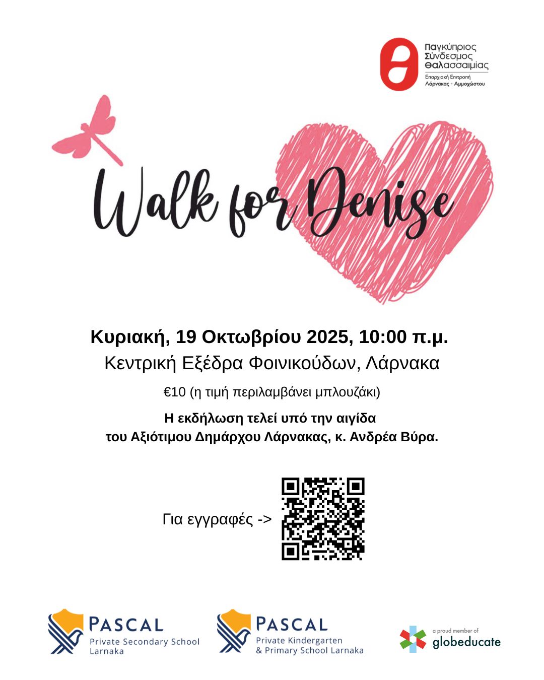 Ο Pascal Private English School σε συνεργασία με τον Παγκύπριο Αντιαναιμικό Σύνδεσμο Λάρνακας, διοργανώνουν τη φιλανθρωπική εκδήλωση «Περπατώ για τη Δέσποινα 2025», την Κυριακή 19 Οκτωβρίου 2025, με στόχο την ευαισθητοποίηση και ενίσχυση του αγώνα ενάντια στη θαλασσαιμία.